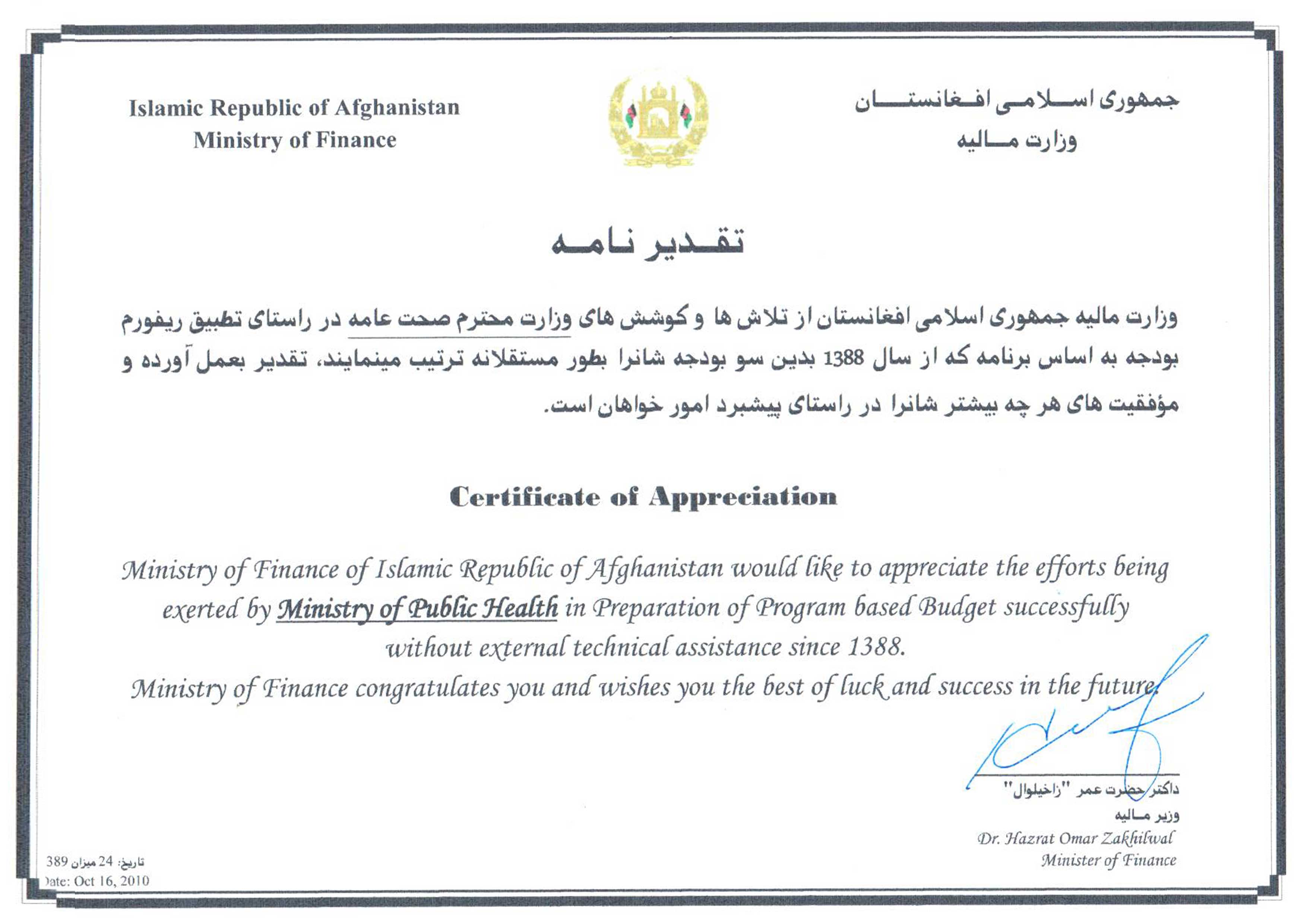 4. Certificate of Appreciation, Ministry of Finance to the Ministry of Public Health in preparation of Program-based Budget, October 2010