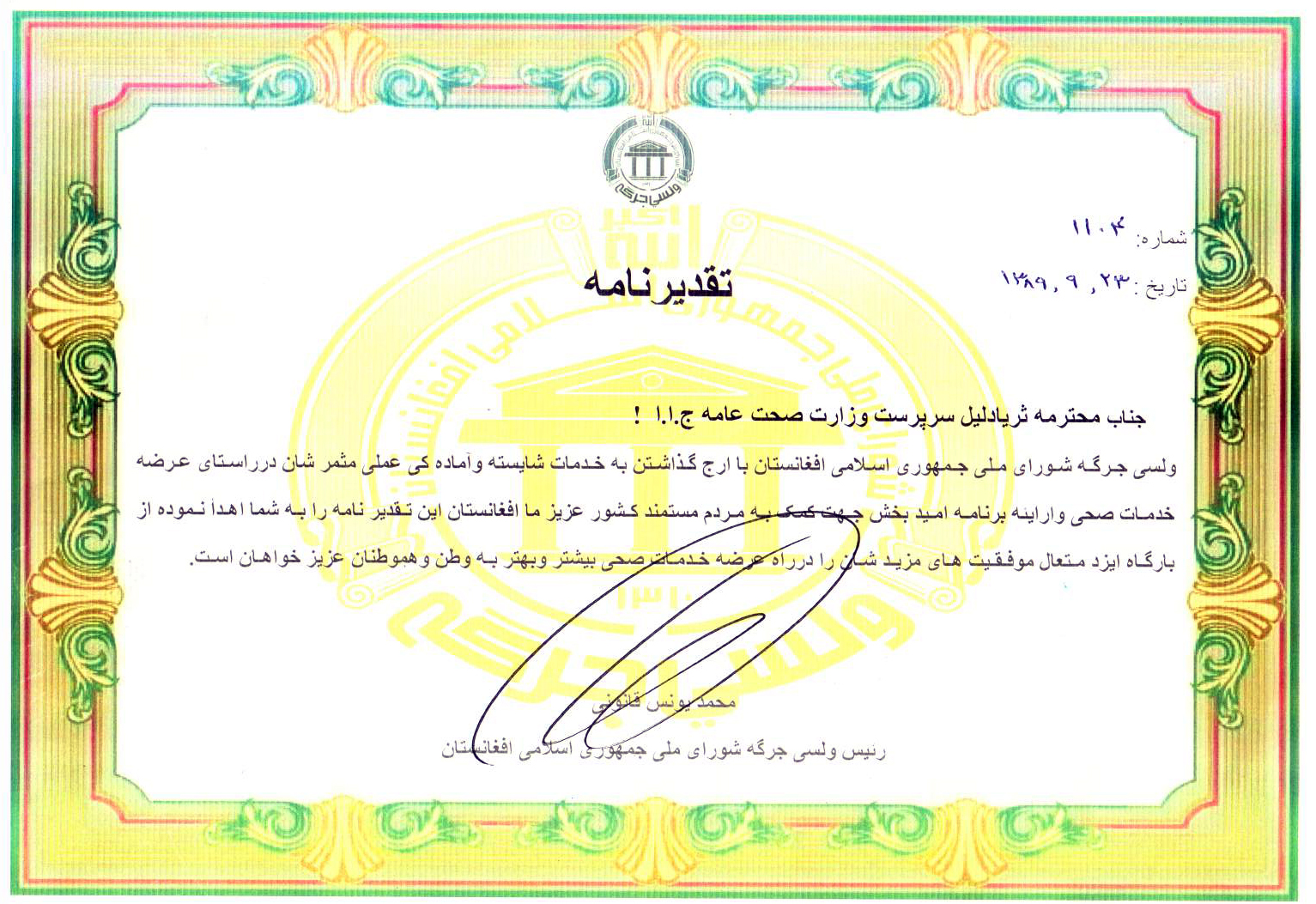 3. Appreciation, Parliament of Islamic Republic of Afghanistan, December 2010